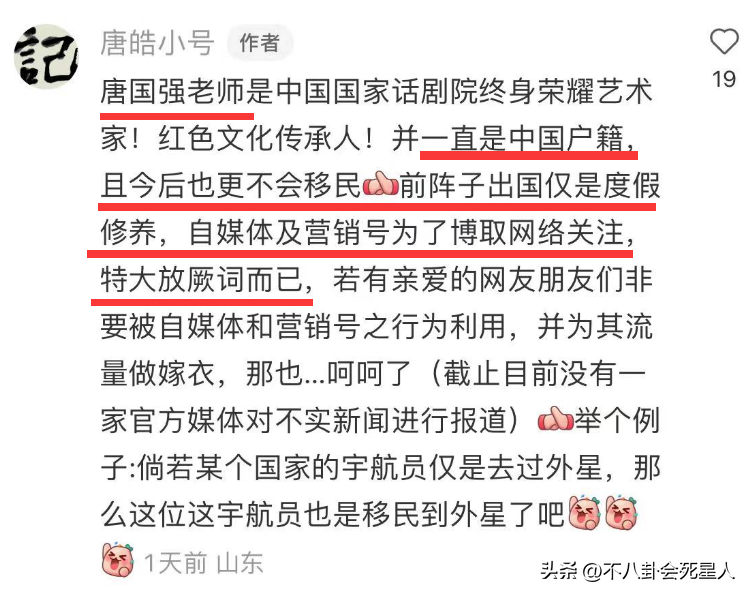 不过后来唐国强的经纪人已经出来否认唐国强移民,说他只是去美国度假。