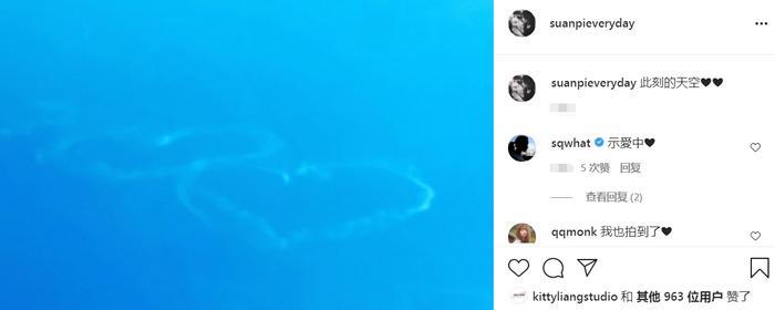 近日,徐静蕾在社交平台发文示爱黄立行,配文称:“此刻的天空❤️❤️”,并晒出了一张照片,照片中,天空中的云朵呈现两颗爱心的形状,舒淇更是在下方留言:示爱中!