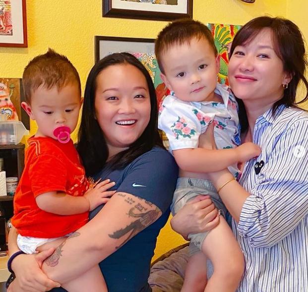 而徐静蕾在社交平台晒出了照片中,徐静蕾抱着一个男孩,另外一个男孩被另外一位女子抱着,徐静蕾配文称:“北加看我俩儿子”。