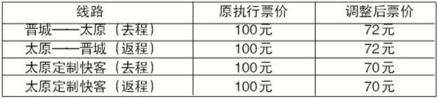 本报讯 昨天,记者从晋城市客运东站了解到,从12月14日起,“晋城—太原”的大巴、定制班线票价下调。