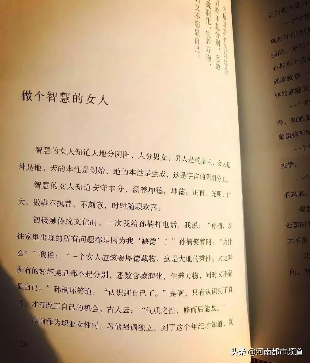 智慧的女人知道天地分阴阳、人分男女;男人是乾是天,女人是坤是地 …… 智慧的女人知道安守本分,涵养坤德。坤德:正直、光明、广大。做事不执著、不刻意,时时随顺欢喜。”初接触传统文化时,一次我给孙楠打电话,我说:“孙楠,以往家里出现的所有问题都是因为我‘缺德’!