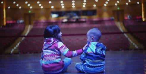 黄少艾将手放在弟弟的头上,他则随意地将双手背在脑后,萌态十足。