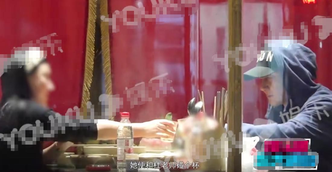 在火锅店里的杜玉明和长发美女十分愉快地共进美食,聊到开心处两人还举杯相共饮自带的高档洋酒。