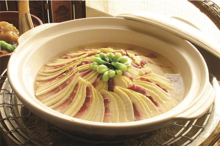 问政山笋是徽州山区传统名菜。 竹笋是徽菜中的一味山珍,问政山笋在所有的笋味中最为鲜嫩,但不够香,加上香肠、香菇等增香,则弥补了不足,这道菜就称为两香问政山笋。将笋加火腿骨、鲜猪肉骨烧焖,中途加进香肠、香菇。成熟后去骨装盘。菜品有红(香肠)、褐(香菇)、奶黄(问政山笋)三种颜色。笋经烧焖则入味透、质脆嫩,有香肠、香菇等混合芳香,是黄山春季时令菜。