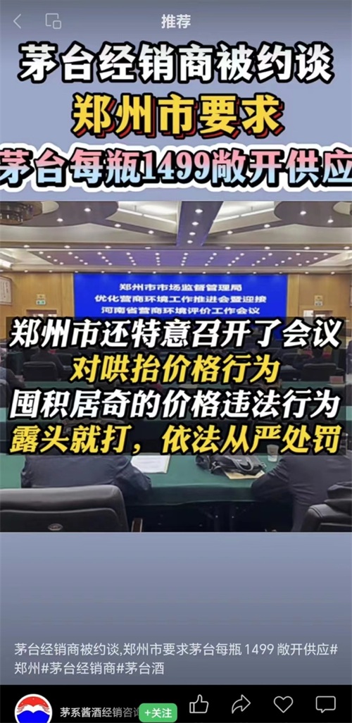 记者打开了王先生提供的视频,除了标题上明确注明:茅台经销商被约谈,郑州市要求茅台每瓶1499元敞开供应,主要内容还有“郑州市还特意召开了会议,对哄抬价格行为、囤积居奇的价格违法行为露头就打,依法从严处罚”。