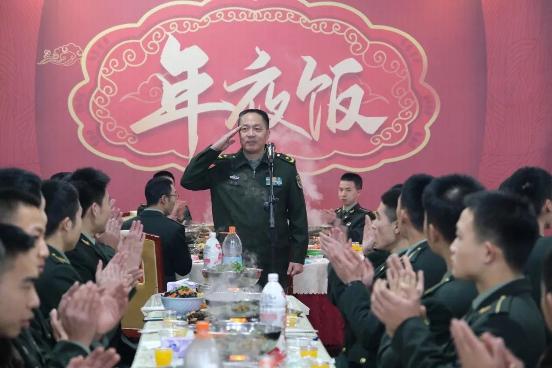 在三号院一食堂,熊熊的炉火正旺,窗花、彩旗和灯笼将食堂装点一新,欢乐喜庆的音乐让年味儿更浓,精心准备的年夜大餐摆满餐桌,黎湘一行与学员们欢聚一堂,共进年夜饭。黎湘向官兵及家人表达了美好的新春祝愿,希望大家珍惜机遇、乘势而上,早日成长为军队需要的优秀人才,努力为强军事业作出贡献。全体官兵深受感动,齐声共祝校首长新春快乐、虎年大吉,祝学校英才辈出、奋进一流。