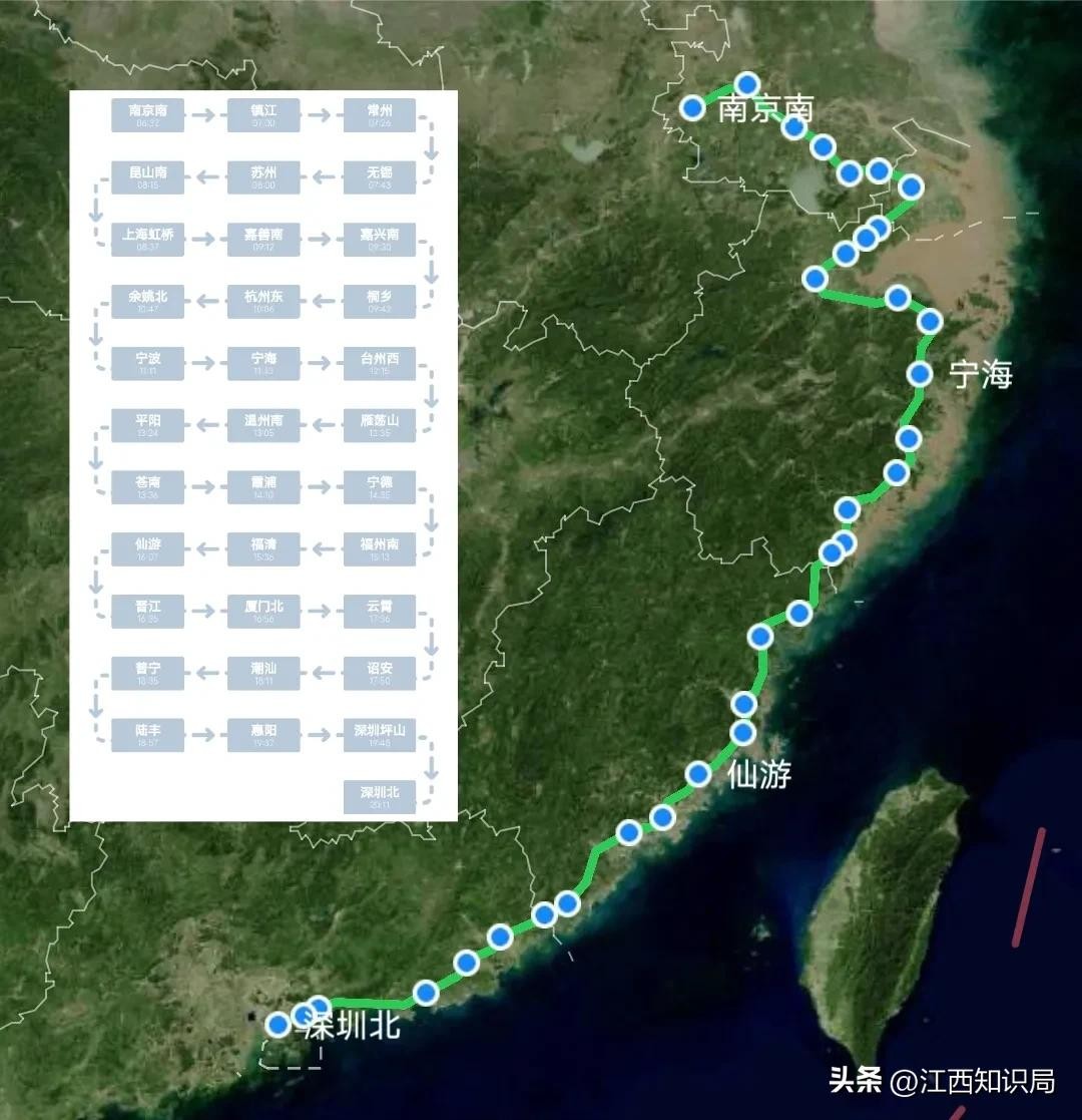 途经线路:宁安城际、安九高铁、昌九城际、昌赣深高铁等。以G2781次列车南京南至深圳为例,列车7:31从南京南出发,15:24到达深圳站,中间一共停靠16个站点,全程1182公里,运行时长7小时53分钟。