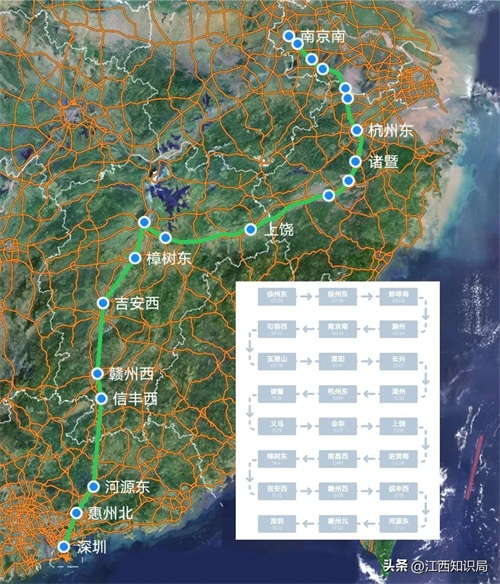 途径路线:宁杭高铁、沪昆高铁、昌赣深高铁等。以G1665次列车南京南至深圳为例,列车9:00从南京南出发(南京南不是始发站),18:10到达深圳,中间一共停靠18个站,全程1525公里,运行时长9小时10分钟。列车需要在南昌西进行转向。
