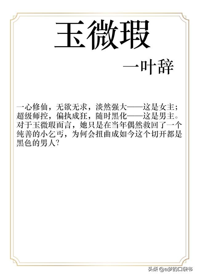 挺好的一本虐男文,印象挺深的。女主是文中武力值天花板,一心只想修仙。一次下山收了还是乞儿的男主,男主真的很黑,每次女主想要收其他徒的时候总是会悄悄搞破坏,就是为了独占女主。但是因为掌门命令,女主还是收了一个女徒弟,后面就是一系列争宠了哈哈。男主从小的独占欲就很强,长大之后更甚。但是女主心中除了大道再无其他,最后女主成仙啦~至于是不是HE,看大家怎么看哈哈。 这本的文笔不是很成熟,但是熬过后面就觉得还不错。