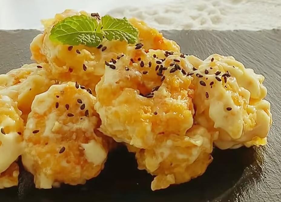 口感味道评价:虾球外裹法芥酱,口感清新,虾肉鲜嫩弹牙,是一道创意十足的菜品。