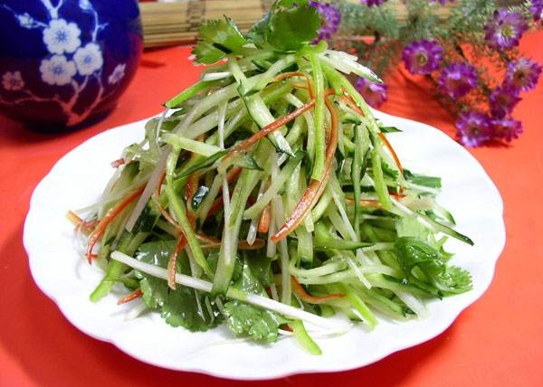 用料:辣椒(青、尖)(100克)、黄瓜(100克)、香菜(50克) 、大葱(50克)、香油(15克) 、酱油(5克)、 盐(3克)、 味精(2克)。