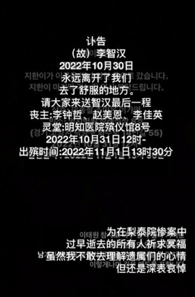 随后李智汉的队友朴熙石、赵晋亨、金道贤在网上发讣告表示“李智汉永远离开了我们,去了舒服的地方,请大家来送李智汉最后一程”,并且在下面标注了地址和时间,最后也对这次在梨泰院遇难的所有人祈福,对所有家属表达哀悼。