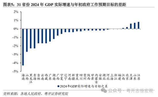 从目标完成情况看,四分之三的省份2024年未能完成GDP增长预期目标。2024年,仅有8个省份GDP增长完成年初预期目标,主要是华东地区经济大省,源于这些省份地方政府目标相对务实、工作更加进取。江苏、山东GDP分别增长5.8%、5.7%,分别超过预期目标0.8个、0.7个百分点,浙江、上海、福建实际增速与目标持平。2024年,全国有23个省份GDP增长未能完成目标,9个省份GDP实际增速与目标相差1个百分点以上。海南GDP预期目标最高,与GDP实际增速的差距最大,相差4.3个百分点。广东GDP增速低于目标1.5个百分点,连续两年未能完成GDP 增长预期目标,与房地产市场持续下行有关。部分化债重点省份经济增速与目标差距较大,与房地产投资下行、当地基建投资受到约束有关,黑龙江、青海、吉林、云南分别低于目标2.3个、2.3个、1.7个、1.7个百分点。西藏、新疆虽然实际增速领先于全国,但与地方政府设定的目标(8.0%、6.5%)仍有一定差距。上述2024年未完成目标的省份中,多数在2025年下调了GDP预期目标,有利于更加务实的推进稳增长任务。