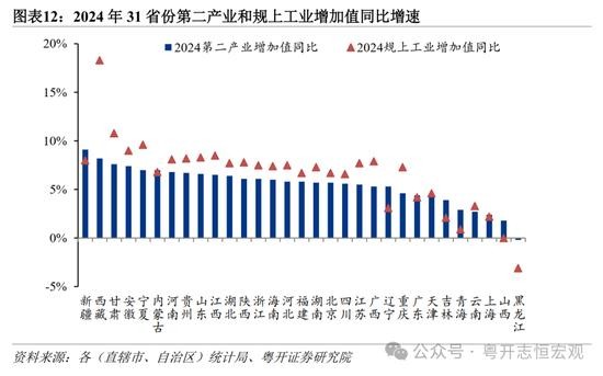 从工业看,工业在名义GDP的比重下降,但对GDP实际增长的拉动率上升。我国工业经济量涨价跌,PPI连续两年负增长,工业占名义GDP的比重下降。2024年,全国三大产业增加值占比分别为6.8%、36.5%、56.7%,第二产业占比较2023年修订数下降0.3个百分点。但工业仍是国民经济的主体和增长引擎,工业经济发展发挥“压舱石”作用。扣除价格因素,工业生产对经济增长的贡献继续提升。2024年,工业拉动GDP实际增长1.7个百分点,较2023年上升0.5个百分点。除了山西、黑龙江外,全国29个省份规上工业增加值实现正增长。一是西部省份加快资源优势向产业优势转化。西藏积极建设绿色工厂,推进水泥、石材产业优化布局,2024年规上工业增加值同比增长18.3%,位居全国第一;甘肃积极推进新型工业化,省属企业加快发展新能源、新材料产业,规模以上工业增加值增长10.8%,位居全国第二。二是中部省份加快承接产业转移壮大制造业集群。河南引入和培育比亚迪、中州时代等产业链主导项目,吸引相关上下游企业集聚,电子、汽车、装备制造等行业成为增长引擎;安徽2024年新能源汽车产量同比增长93.4%,汽车总产量位居全国第二,汽车制造业增加值增长26.7%,是工业增长的最大贡献来源。江西借助“两新”政策,推动装备制造业和电子制造业快速增长,2024年江西智能手机产量位居全国第三,同比增长44.2%。三是东部省份加快壮大新兴产业和数字经济。江苏、浙江规上工业增加值分别增长7.7%、7.5%,行业大类增长面分别达85%、82%。江苏制造业高质量发展指数连续4年全国第一,高新技术产业产值占规上工业比重首次超过50%,工业战略性新兴产业产值占规上工业比重达41.8%。浙江提升数字经济优势,数字经济核心产业增加值增长7.6%,规上工业企业数字化改造实现全覆盖。