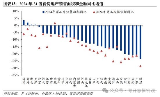 从投资看,多数省份制造业投资和基建投资景气,房地产投资处于探底期。2024年,全国固定资产投资保持平稳增长,分领域看,制造投资保持高景气度,房地产投资依然低迷,基建投资结构分化,中央财政主导的水利投资高增长、地方主导的交通投资承压。从2024年目标完成情况看,受益于“两重”政府投资发力、民间投资信心回暖,西藏、宁夏、河南、河北、江西等固投增速高于全国,且完成了预期目标。分区域看,东北、东部、中部和西部地区投资分别增长4.2%、1.3%、5.0%和2.4%。中部地区高技术制造业、装备制造业投资快速增长,河南、湖北、安徽、湖南制造业投资分别增长24.7%、15.4%、13.3%、9.5%;四省民间投资分别增长10.5%、3.0%、1.7%、4.0%,表现均好于上年。分省份看,全国有28个省份固定资产投资正增长,20个省份投资增速跑赢全国水平,西藏、内蒙古固投增速连续两年占据全国前两位,受基建投资增长带动明显,内蒙古基建投资占全部投资的比重超40%。华南、西南地区一些省份投资增速缓慢,云南、广东、广西三省份投资负增长,分别下降7.7%、4.5%、3.2%;重庆、贵州投资仅增长0.1%、0.4%。一是由于房地产投资下滑,广东房地产开发投资下降18.2%,拖累投资增长超5个百分点。二是高风险省份地方财政优先化解债务风险,地方财政主导的投资被动压缩。2024年,甘肃固定资产投资按项目单位隶属关系划分,中央投资上升47.2%,而地方投资下降2.2%;云南基建投资下降4.0%,其中交通投资下降13.0%。