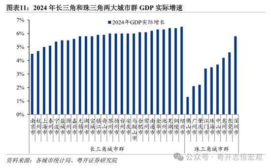 2024年,中国区域经济增长“西快东慢”,西部地区领先,中部地区提速,东部地区遇阻。从实际增速看,2024年实际GDP增速前十名中,西部省份占6席,东部省份占2席,中部省份占2席。从名义增速看,前十名中,西部省份占6席,东部和中部省份分占3席、1席。2024年,东北、东部、中部和西部地区名义GDP同比分别增长2.7%、4.4%、4.4%、4.8%。总体上,各大区域经济增速接近,西部地区经济增速相对更高,一是由于多数省份经济体量小、潜力大;二是受到产业转移、绿色转型、扩大开放的三重利好驱动,加快将能源优势向产业优势转化,打造经济新增长点。中部地区经历2023年经济调整期之后迅速修复,受益于区域重大战略,产业协同创新推进,2024年名义GDP增速加快0.6个百分点。长江中游城市群成为区域增长极,湖北2024年名义GDP增长5.7%,排名全国第二。东部地区增长放缓、区域分化,长三角城市整体表现好于珠三角。东部地区2024年名义GDP增速放慢0.7个百分点,不同城市面临产业结构调整、房地产市场探底、消费意愿低迷等多重阻力。长三角城市群26市GDP加权平均增长5.5%,超过全国平均水平;而珠三角九市加权平均增长3.7%,低于全国与长三角平均增速。由于不同城市产业结构与房地产市场调整节奏不同,广佛肇等珠三角城市仍处于产业转型阵痛期和房地产调整消化期。东北地区经济仍处于“漫长的季节”,受制于人口外流、产业竞争力下降等因素,辽宁、吉林、黑龙江名义GDP分别增长3.9%、3.0%、0.0%,远低于全国平均水平。