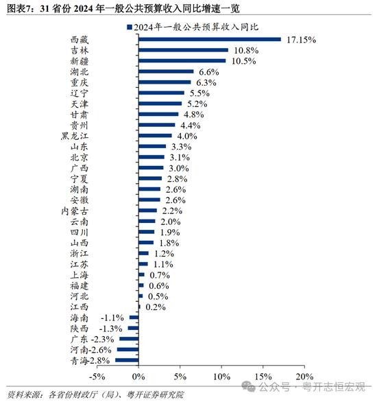 分省份看,2024年地方财政收入增速有所放缓,西部地区财政收入增速快于中东部地区。受房地产调整转型、物价低迷、税收优惠政策等因素影响,2024年全国和地方财政收入增速均大幅低于2023年。分区域看,2024年,东北、东部、中部、西部地区财政收入分别增长6.2%、0.8%、1.8%、3.2%,西部地区财政收入增速快于中部和东部地区,东北地区财政收入增速较快主要源于非税收入高增。西部省份一般公共预算收入整体快于东部和中部。这种格局的变化主要源于百年未有之大变局背景下,能源安全的重要性抬升,“一带一路”的重要性上升,西部资源密集型省份经济和财政收入增长相对较快;而东部和中部省份遭遇外需波动加剧、房地产低迷等多重压力,经济结构和产业结构持续调整,财政收入增速相对偏慢。分省份看,26个省份2024年一般公共预算收入正增长,广东、河南、陕西等五省份一般公共预算收入下降。2024年税收收入增长压力较大,20个省份地方税收收入同比负增长。由于2023年制造业企业缓税入库抬高基数,多个省份2024年增值税收入同比负增长;受到汽车市场“内卷式竞争”冲击工业企业利润、房地产市场持续低迷等影响,广东、吉林等地企业所得税收入负增长;受房地产市场拖累,多个省份契税、土地增值税收入下滑明显。