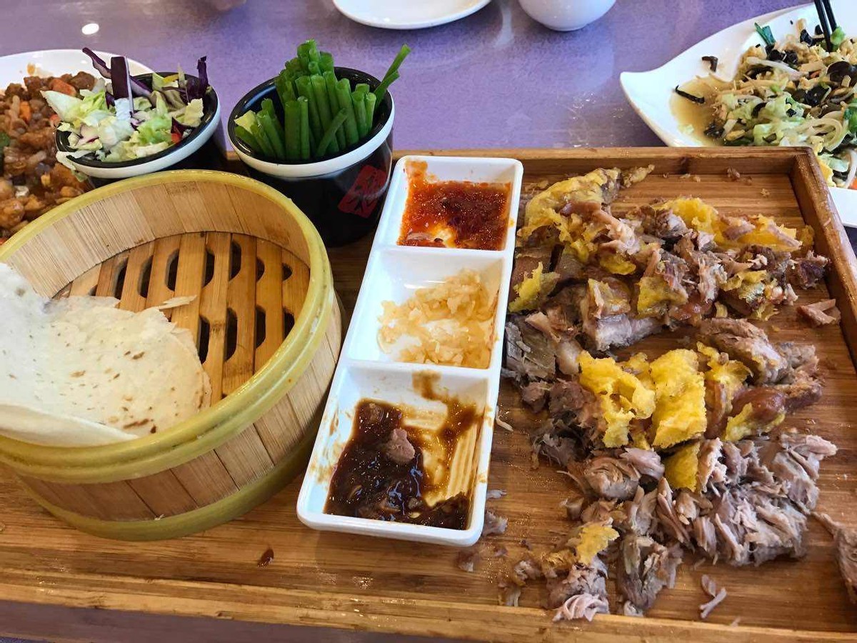 这道菜的制作过程和北京烤鸭很相像,都有烙饼、黄瓜丝、蘸料之类的,但味道上可能更胜一筹。