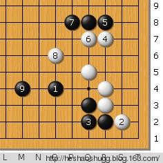 图1-7,黑1小飞,白2扳就上当了。到9,黑两面都下好了,白地有限,当然黑好。
