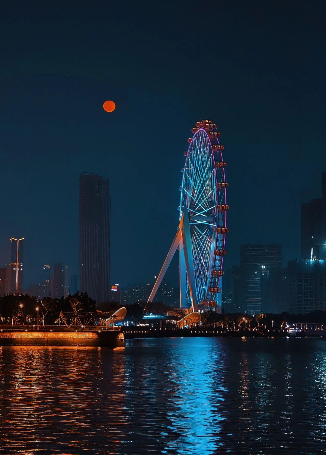 欢乐港湾的摩天轮在夜间被灯光点缀得非常迷人,是拍照的好地方。周围的商业区也很繁华,适合晚上逛街休闲。