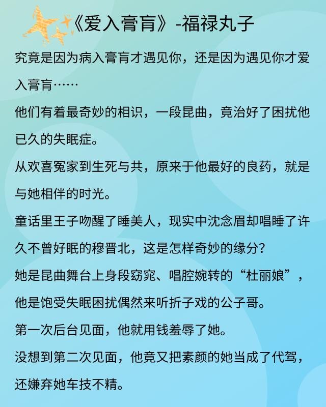 《爱入膏肓》讲述的是沈念眉与穆晋北的爱情故事,沈念眉是昆曲演员,穆晋北有着严重的失眠症,某天发现听她唱曲可以睡得很香,所以经常去听曲,更因此认识她。