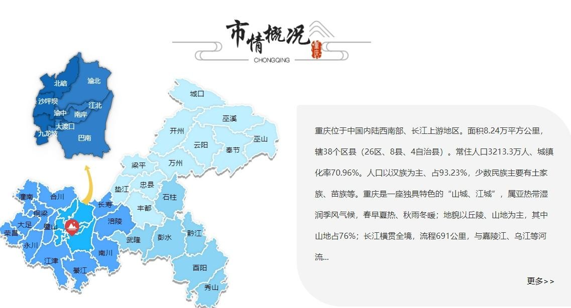 重庆位于中国内陆西南部、长江上游地区,面积达8.24万平方公里,有十几个上海市那么大。辖26区、8县、4自治县,城镇化率70.96%——也就是还有900多万农民,城镇人口也不全集中在城区,事实上城区人口是1600多万——这个数据也排名全国前列,但就不如上海了。