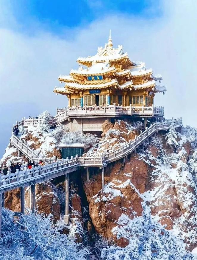 老君山传闻是老子的归隐之地,山上有十几处庙宇,下雪后的庙宇更是表现了道教文化的庄严和神圣。