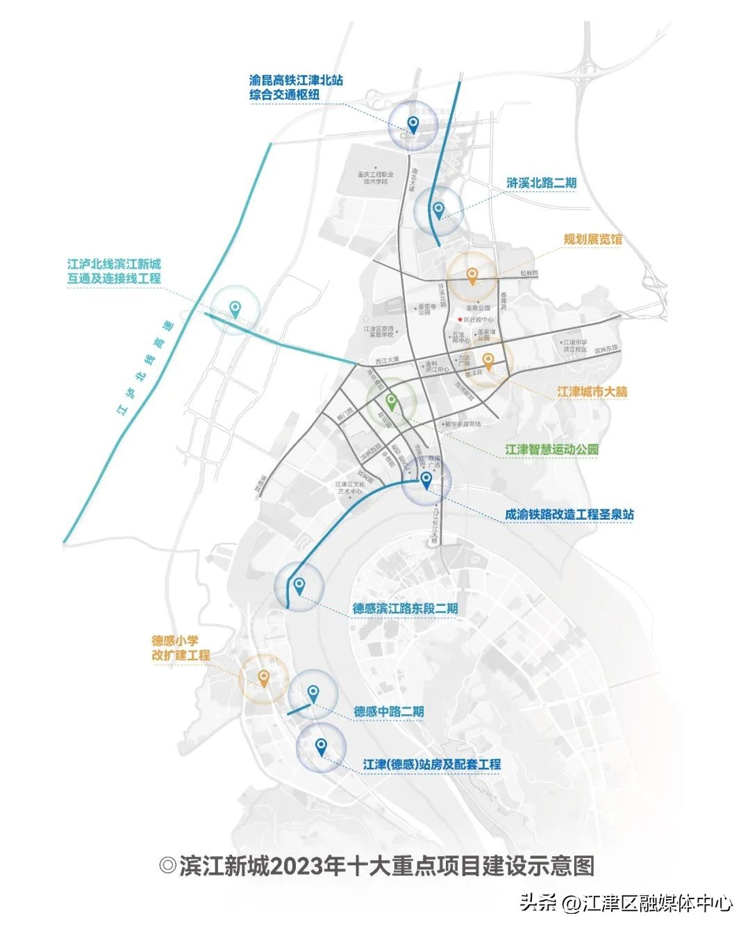 当前,滨江新城正加快推进“城市会客厅”十大重点项目建设。以“一线”(燕子岩隧道暨江泸高速连接线项目)“两铁”(渝昆高铁江津北站及综合交通枢纽工程、成渝铁路公交化改造江津站和圣泉站工程)“三路”(浒溪北路二期、德滨路东段二期、德感中路二期),加快轨道建设及交通道路通畅便捷,实现“四向突破”。