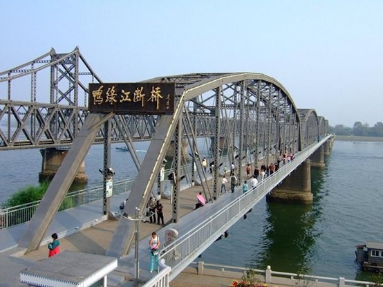 断桥横跨鸭绿江,毁于朝鲜战火,它是日寇为掠夺我国资源于1905年修建的。1950年11月8日,美军为绝断苏、中两国对朝军援和阻止志愿军入朝,驱动战机将朝方一侧炸断,仅剩我国一侧四孔。为不忘战争,倡导和平,我国政府于1993年将它开发成旅游景点,并于2006年公示为全国重点文物。