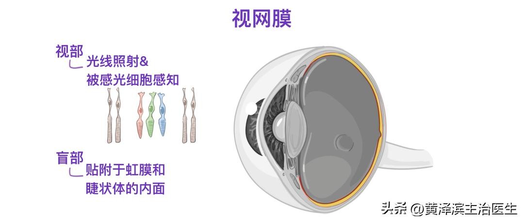 视网膜有两个不同的部分:一个是脉络膜层正下方的视部,光线在此照射并被感光细胞感知,另外一个是盲部,贴附于虹膜和睫状体的内面。