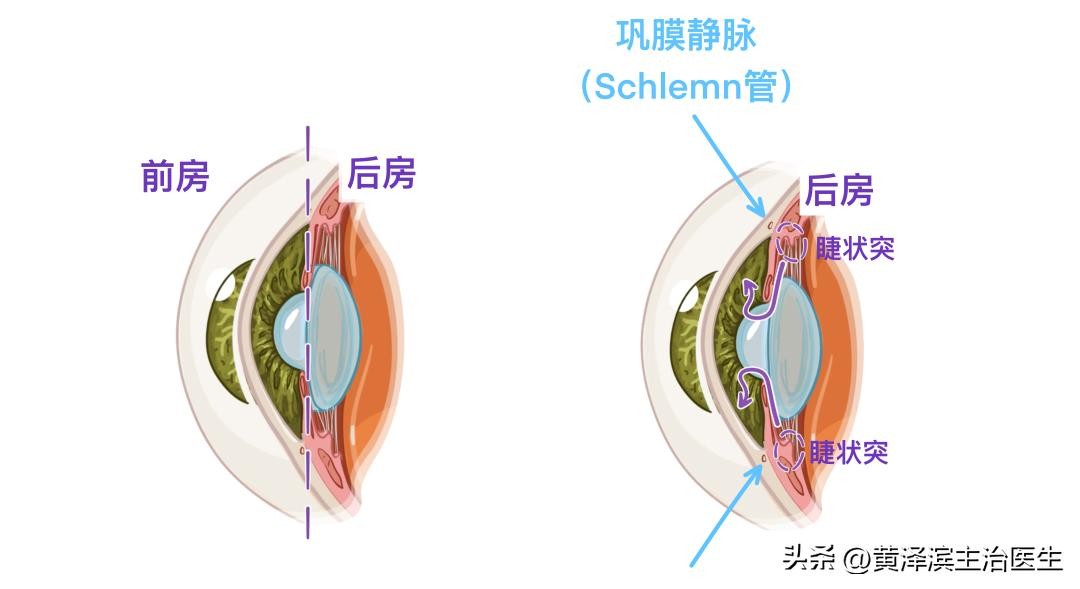 眼前节进一步分为前房,在角膜和虹膜之间,还有一个后房,在虹膜和晶状体之间。房水由后房中的睫状突产生,通过瞳孔进入前房。