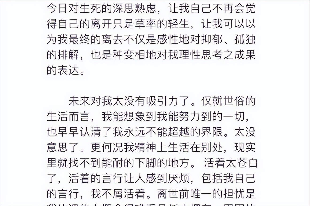 “成名之后我明白了两件事,这两件事让我没有了继续活下去的念想,所以我决定离开这个复杂的世界。”