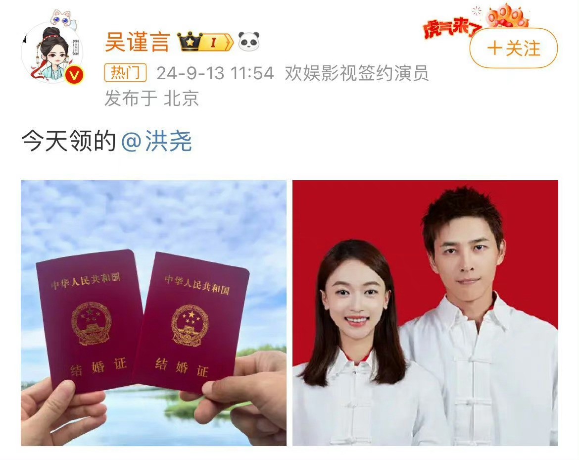 2024 年 9 月 13 日,吴谨言与洪尧纷纷于微博晒出结婚证,其配文简洁:“今天领的”“今天结的”,且相互艾特。