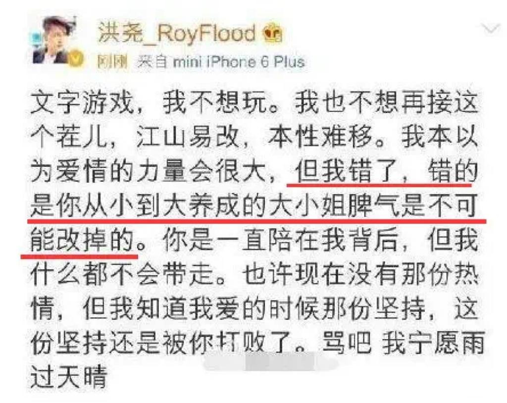分手后的洪尧,却在社交平台上暗戳戳地发文,暗示曹赢心劈腿,并指责其有“大小姐脾气”,将分手的责任推卸给对方。