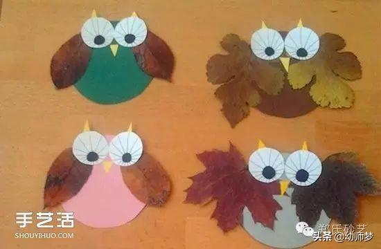 树叶贴出的小鸟和猫头鹰。