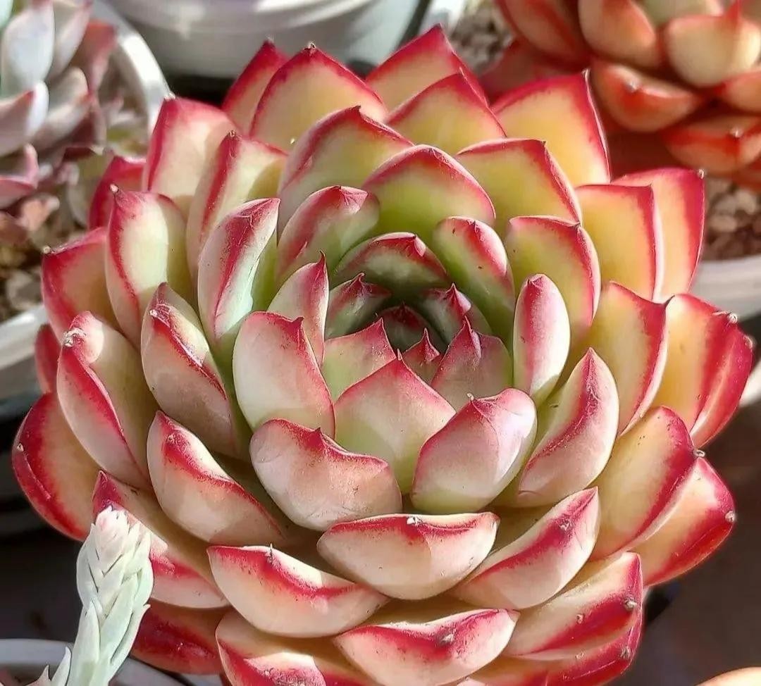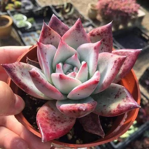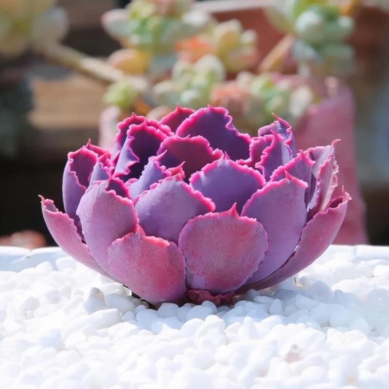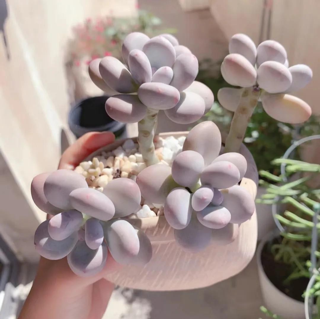 白牡丹平常为白色,日照时间增加后叶尖及叶边会变为粉红色,适合摆放在阳光充足处。