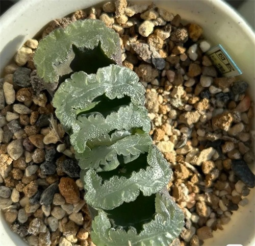 40.晚霞它的叶片边缘呈现细褶状,就像舞裙的边,叶面履了一层薄白霜,显得更美丽了。如果给它光照充足和大温差的环境,晚霞之舞的叶片会变为漂亮的粉红色和紫红色,很迷人。