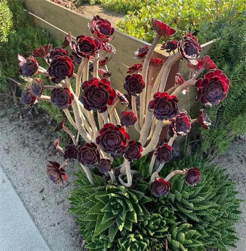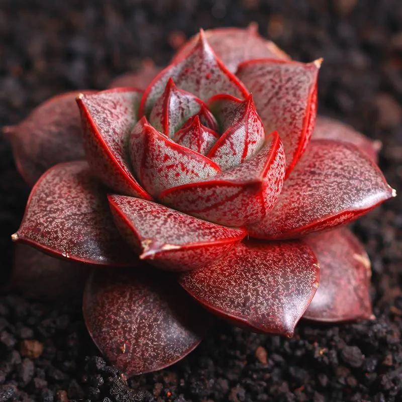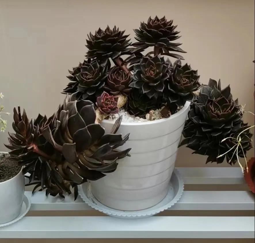 黑王子叶片长匙形、带有明显的叶尖,叶色大部分时间以深黑色或红褐色为主,株型为端正的莲座状,肉质茎特别短,远远望去如同一朵黑色的莲花。