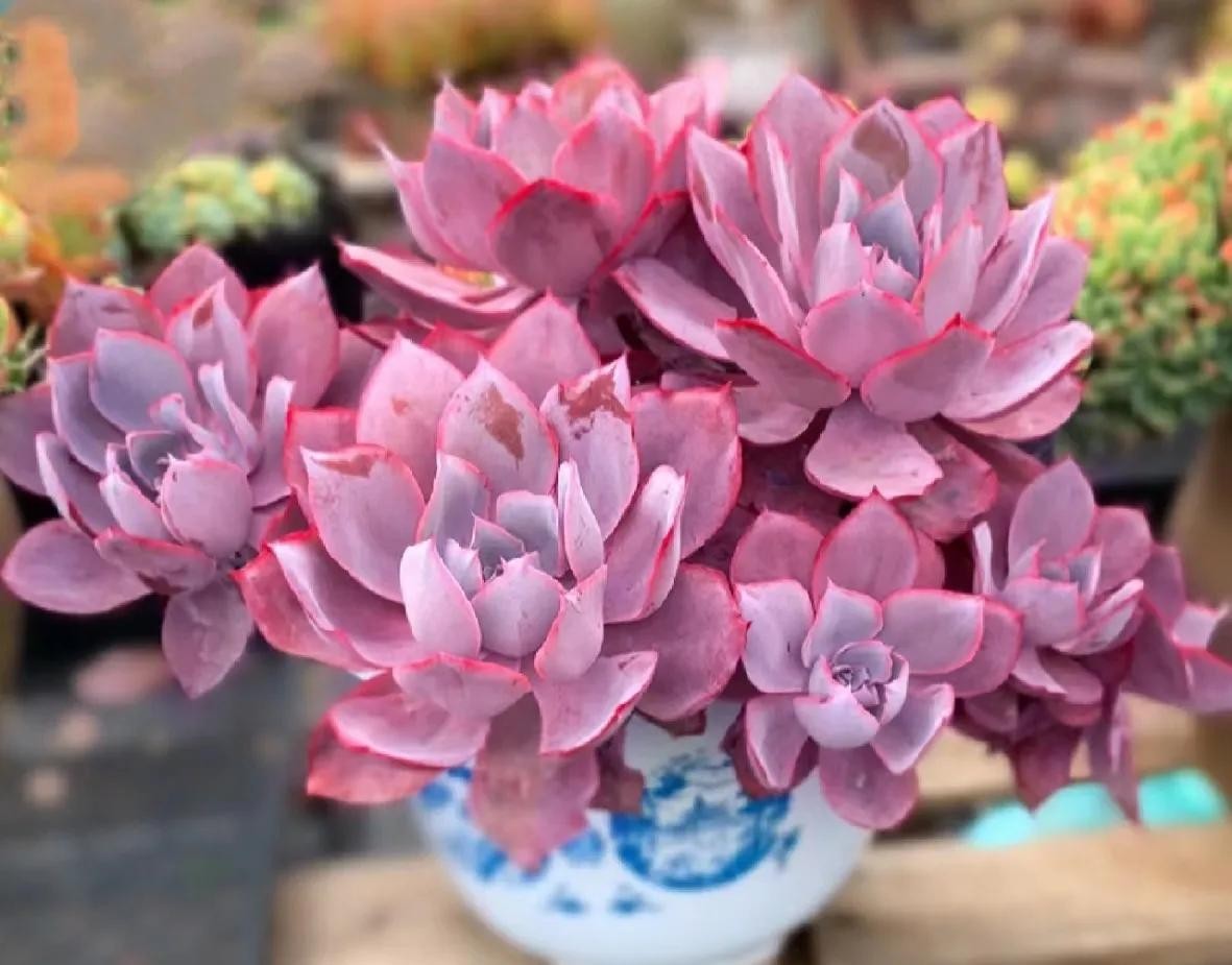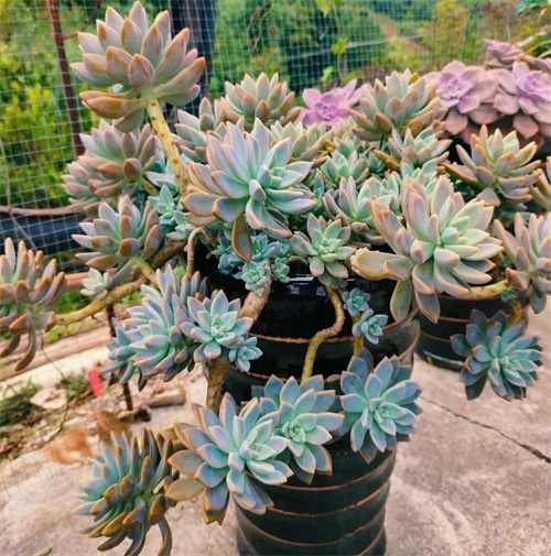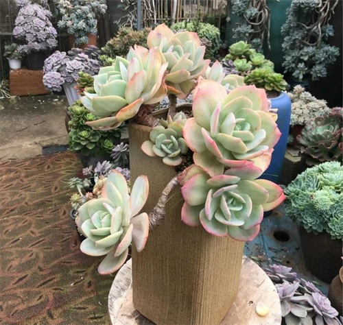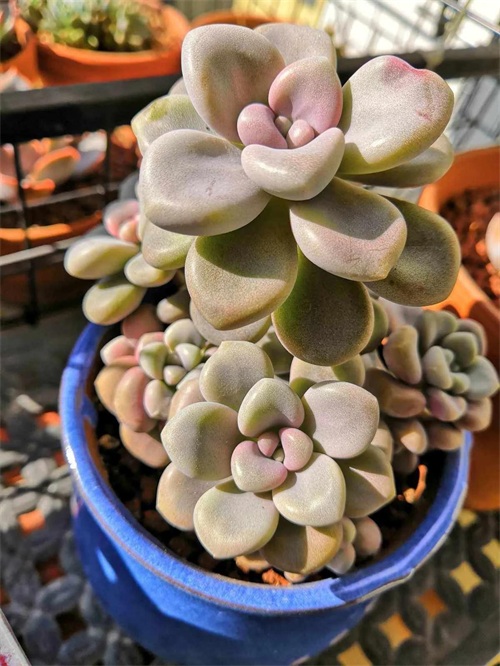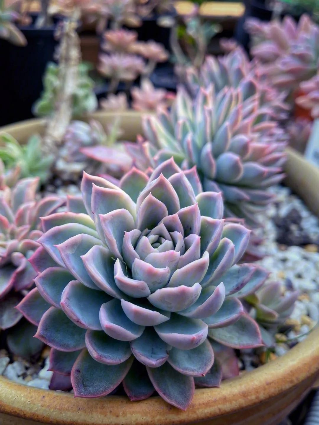 欧菲娜叶色非常多变的品种,不同季节可呈现粉白色、粉红色、粉蓝色、粉紫色等多种色调,夏天会变紫。