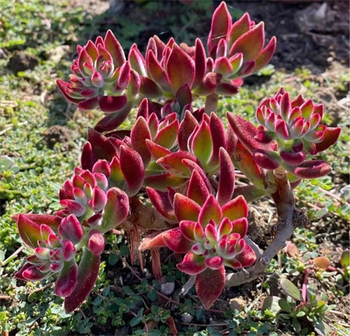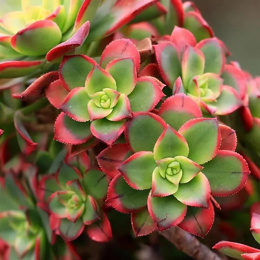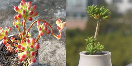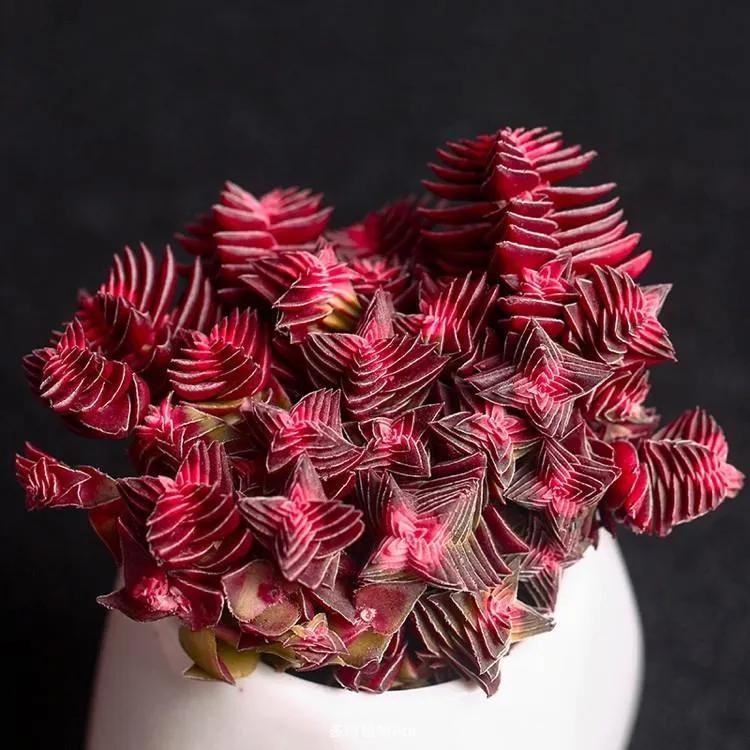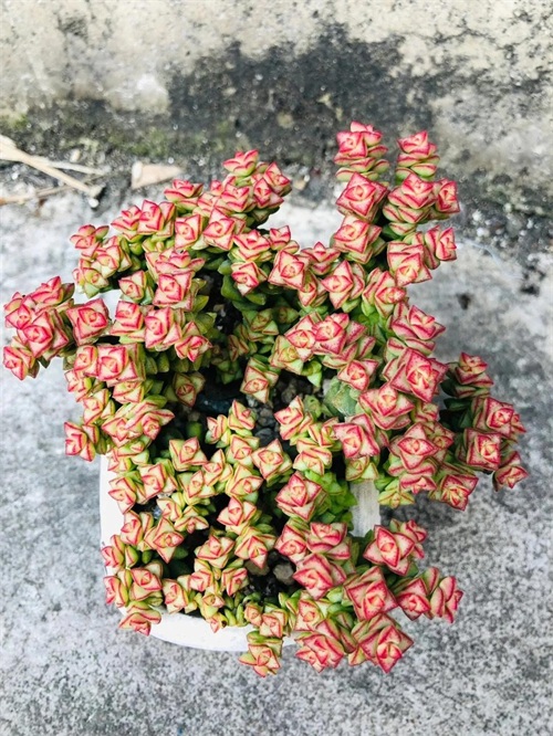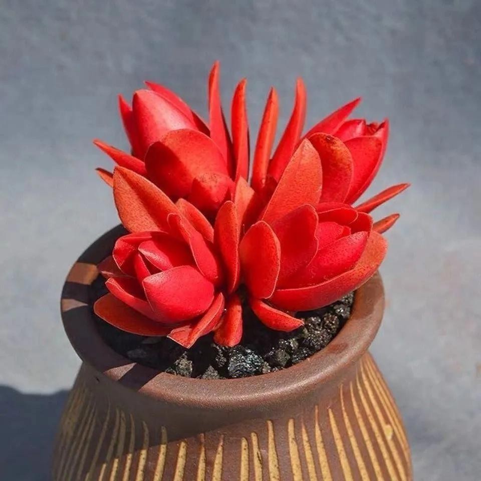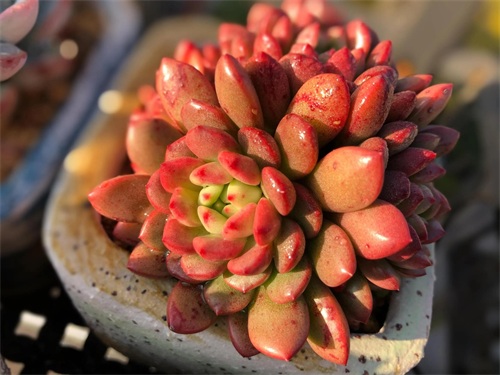 叶片为细长匙状,前端较肥厚、斜尖,呈莲花状紧密排列,整体较包。红宝石叶片非常光滑,因此不管是秋冬季节变红或者夏天变绿的时候,颜色都比较醒目,看上去非常赏心悦目。