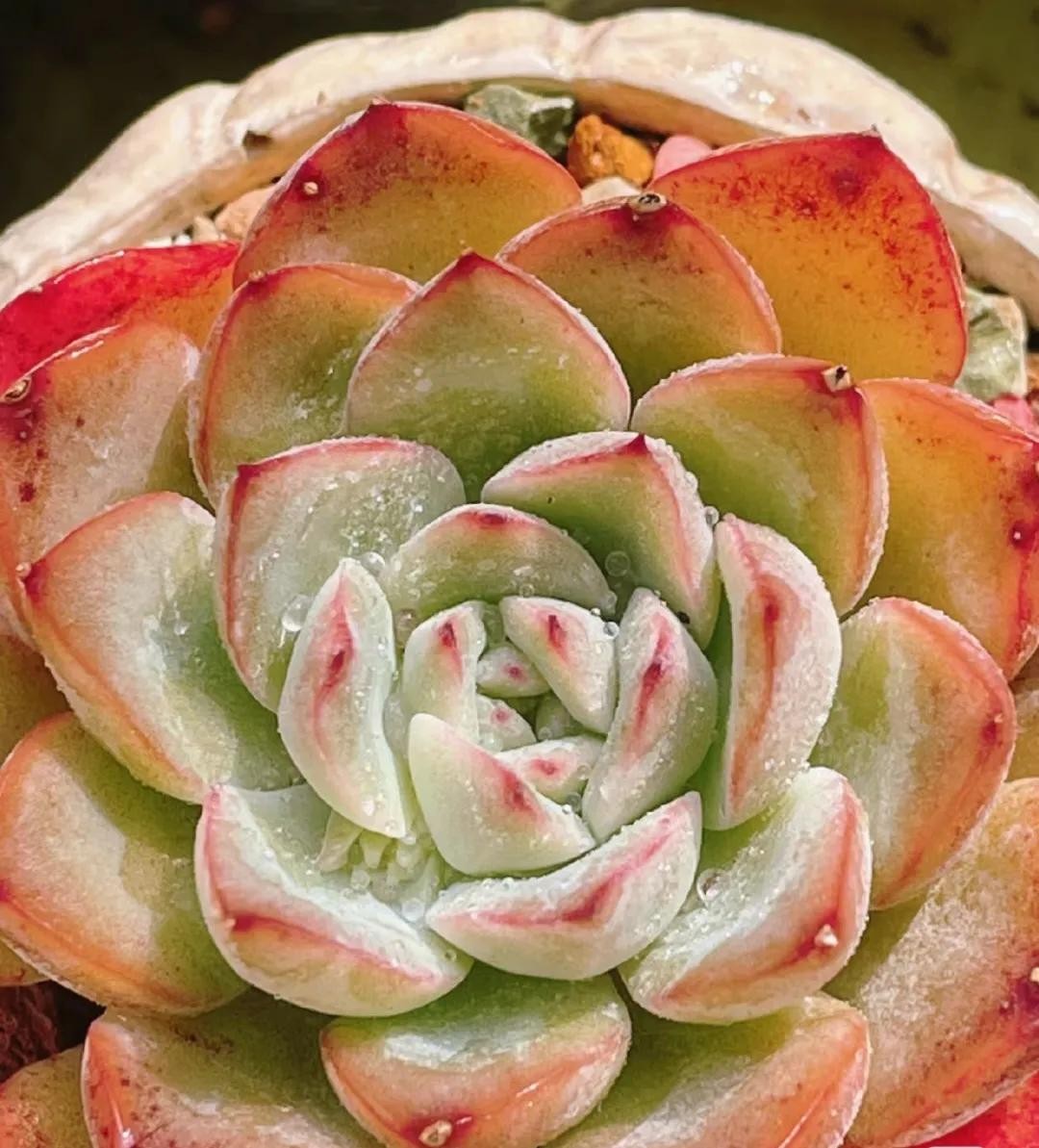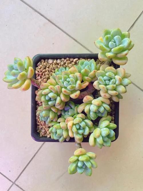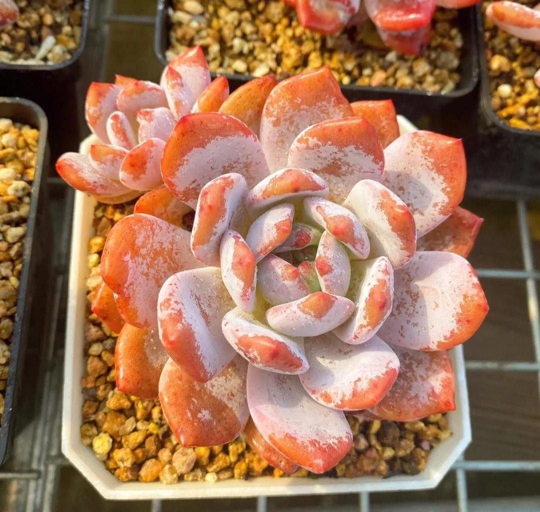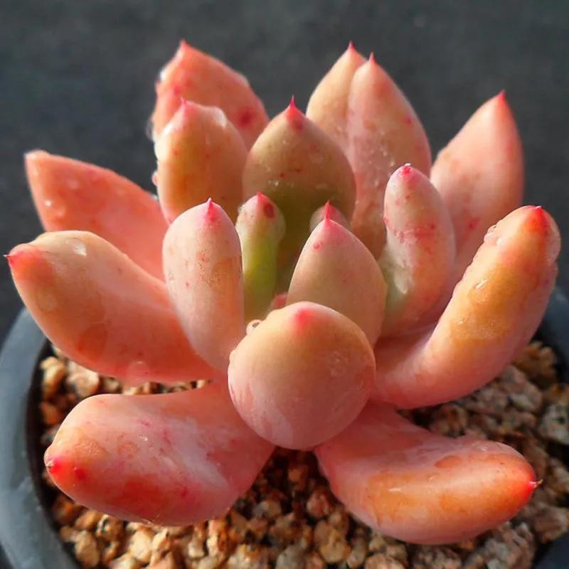 淡雪是很多人喜欢的一个多肉品种,很多人都说它清新淡雅,出状态像淡淡的雪一样清丽脱俗,因为淡雪出状态的时候叶片会变成半透明,叶色呈现淡淡的橙色,再加上叶片细腻白粉的映衬看着有点粉妆玉琢的仙气。