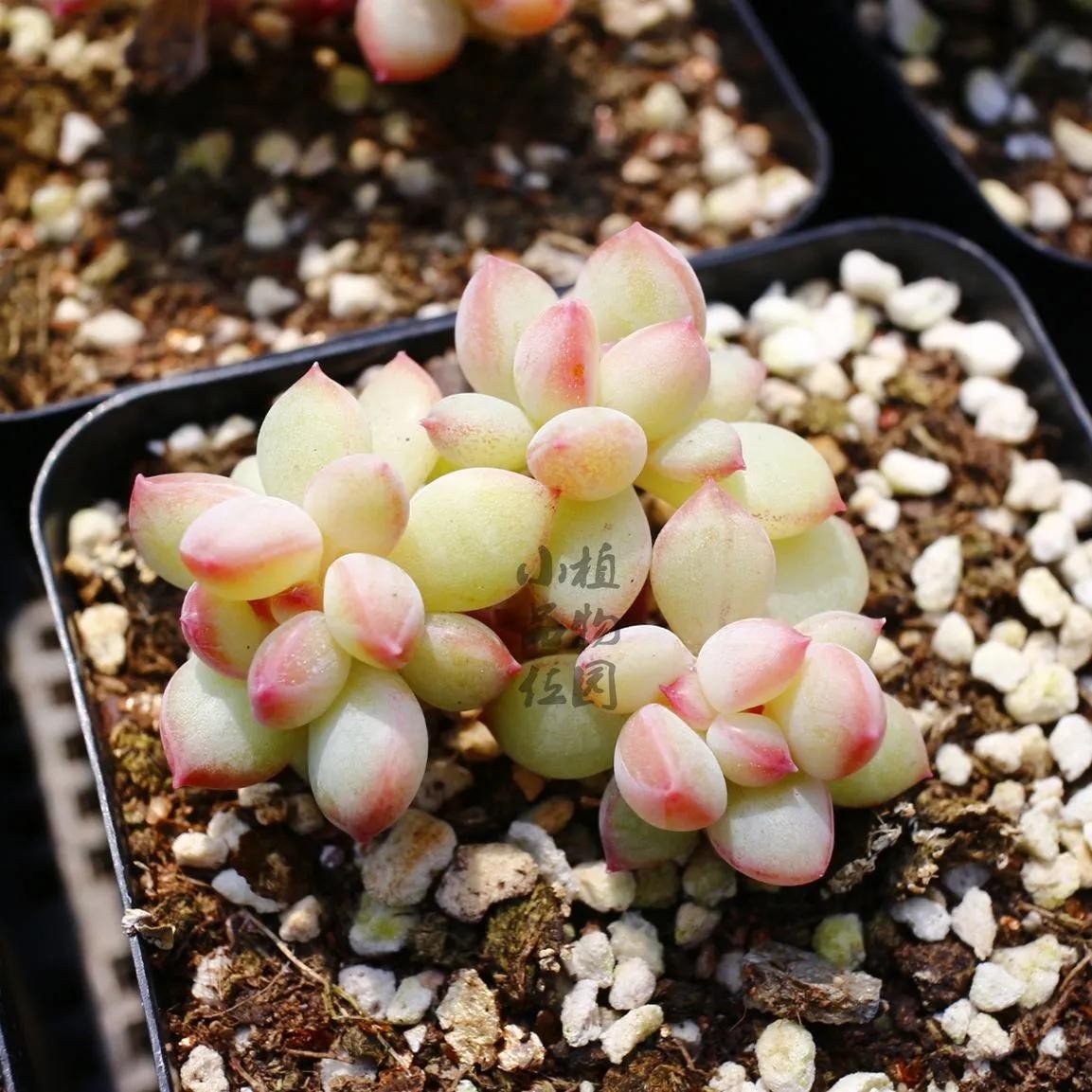 桃美人,与桃蛋长得极为相似,但还是有些差异。是由月美人和稻田姬杂交而来的园艺品种。桃美人叶片上会长一层白色的粉,相较于桃蛋的透亮,桃美人有一种哑光的质感。