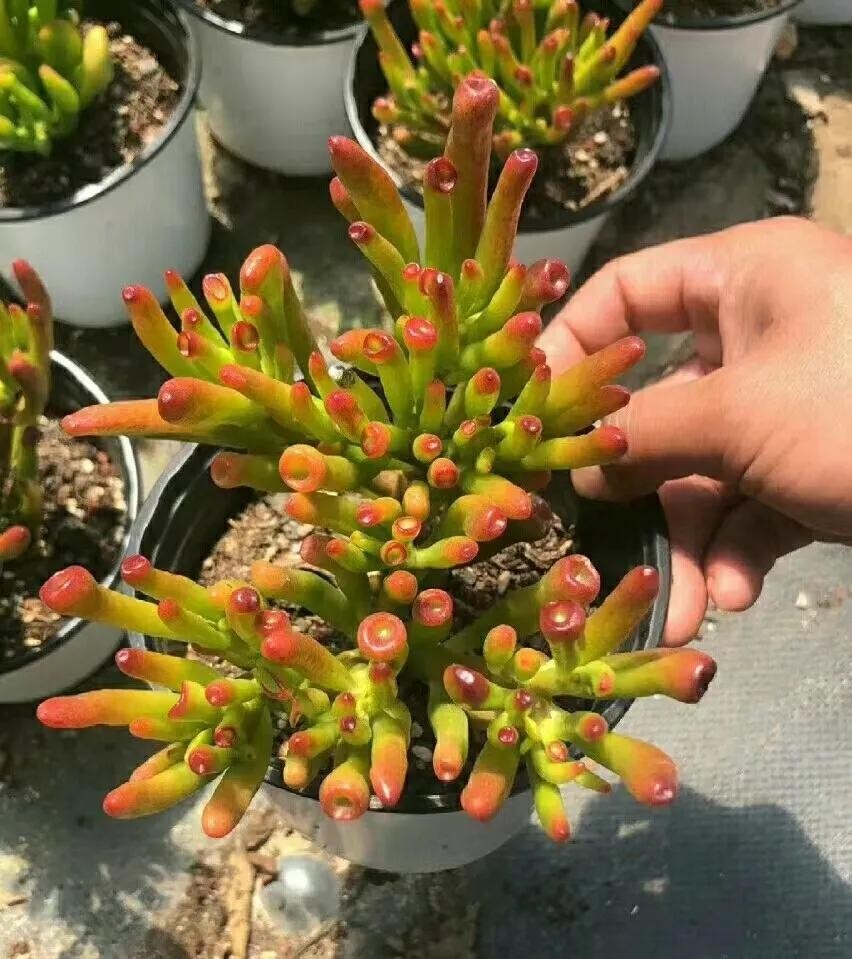 虹之玉肉质叶膨大互生,圆筒形至卵形,长2厘米,绿色,表皮光亮、无白粉,在阳光充足的条件下转为红褐色,甚至变为全红。
