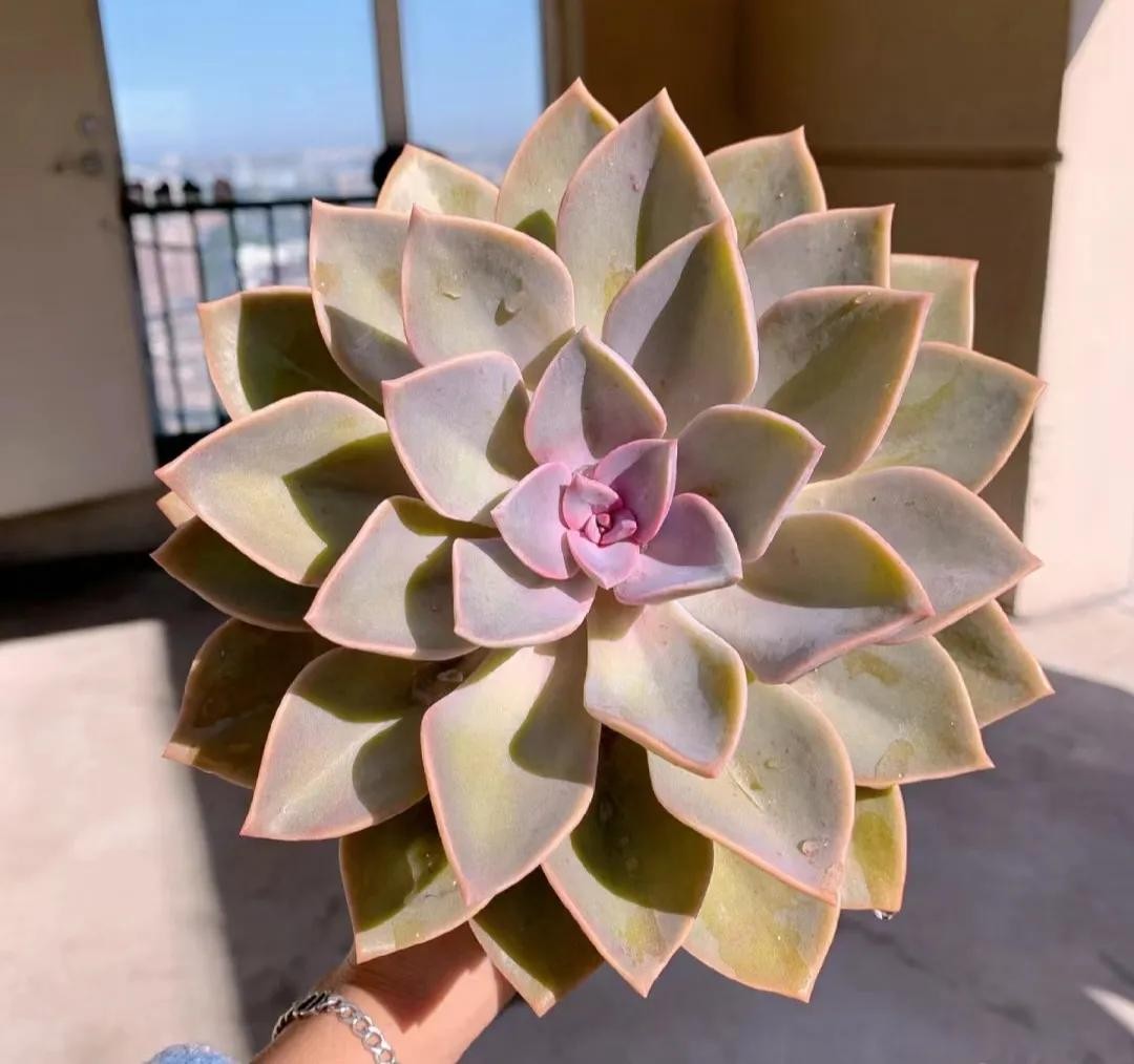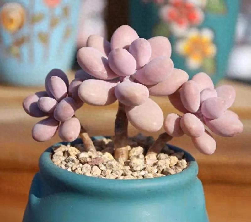 出状态的紫乐,其叶片粉嫩,颜色艳丽,肥厚宽大的叶片,看着有点萌。紫乐在多肉圈内可是出了名的大普货,既好养,又容易出状态,而且还能很好的塑造造型。