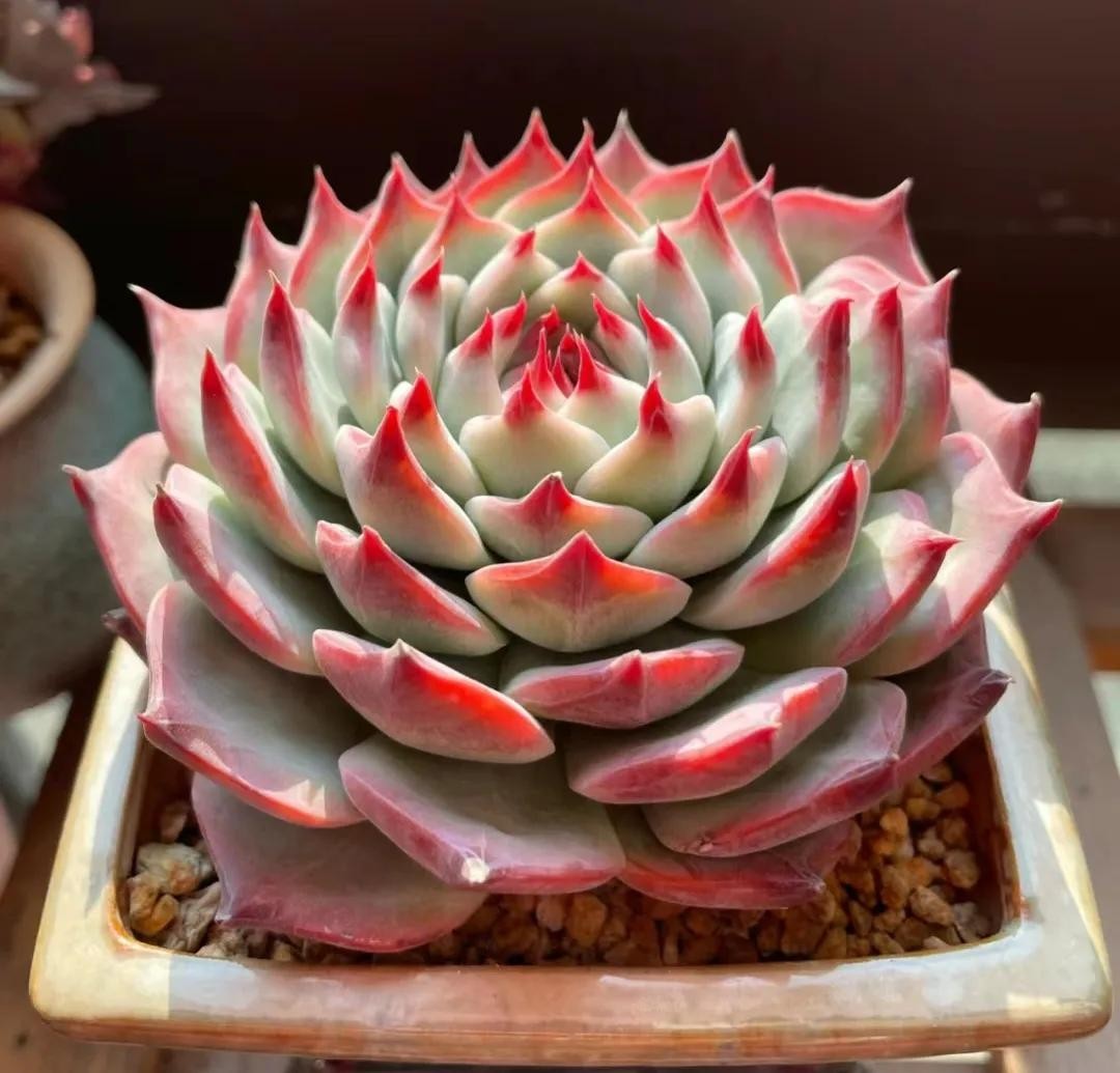 雨燕座是较大型的石莲花品种,叶剑细长,叶缘红色,有点像花月夜,又有一些像月光女神