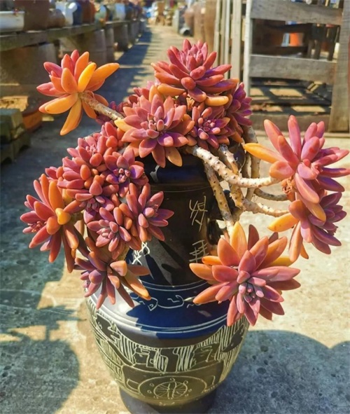 秋丽的叶片较细长,正面平滑微下凹,背面明显突起似龙骨状,顶端稍尖,但整体仍较圆润。春秋冬季节,在充足的光照下叶色很多变,呈现出粉、橙、红、紫、黄等多种颜色。