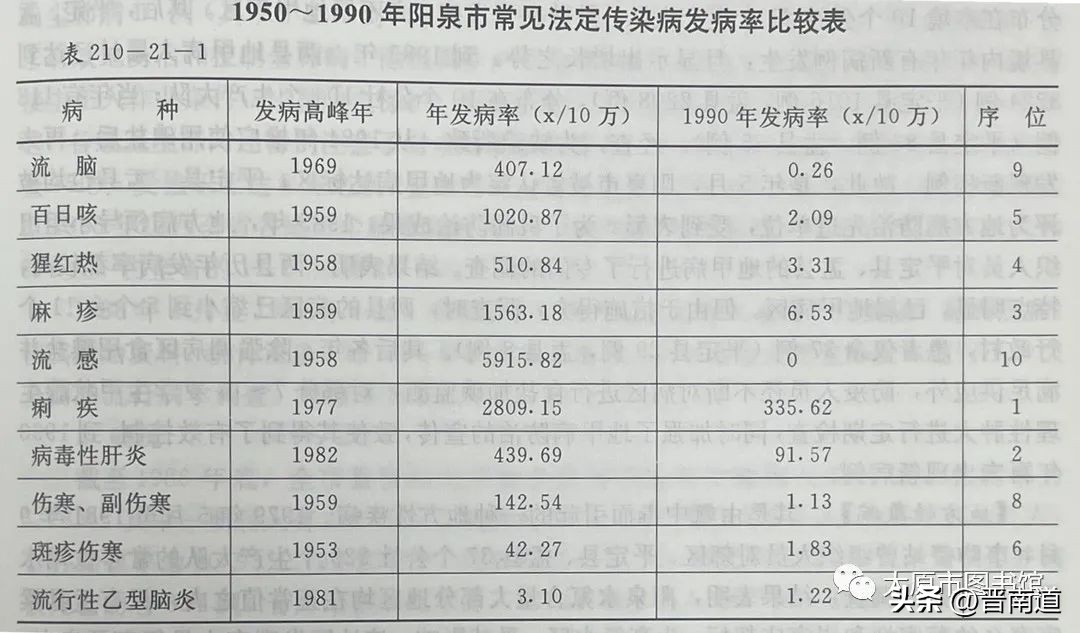 图为1950-1990年阳泉市常见法定传染病发病率比较表
