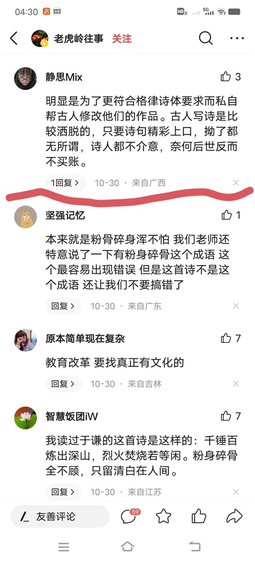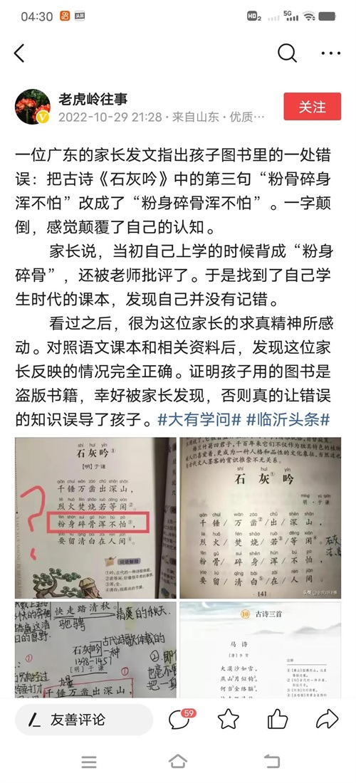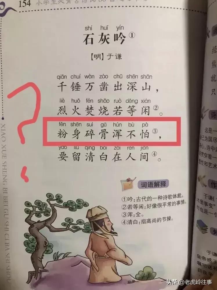 有的网友特别较真,发现于谦的“石灰吟”也有类似细节。“千锤万凿出深山,烈火焚烧若等闲;粉身碎骨浑不怕,要留清白在人间”。发现现在学生课本写的是“碎骨粉身”,且有图有证据,而且不止一个课本这样。一场争论,又要开始。而真相,也呼之欲出。