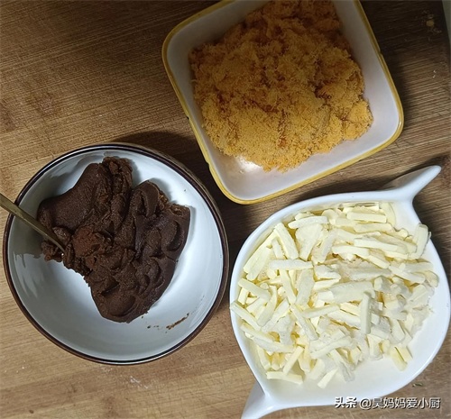 馅料:豆沙、芝士、肉松,以上3种是我自己用到的馅料,没有特别的规定,根据各人口味添加。