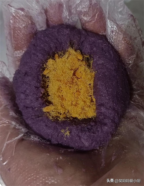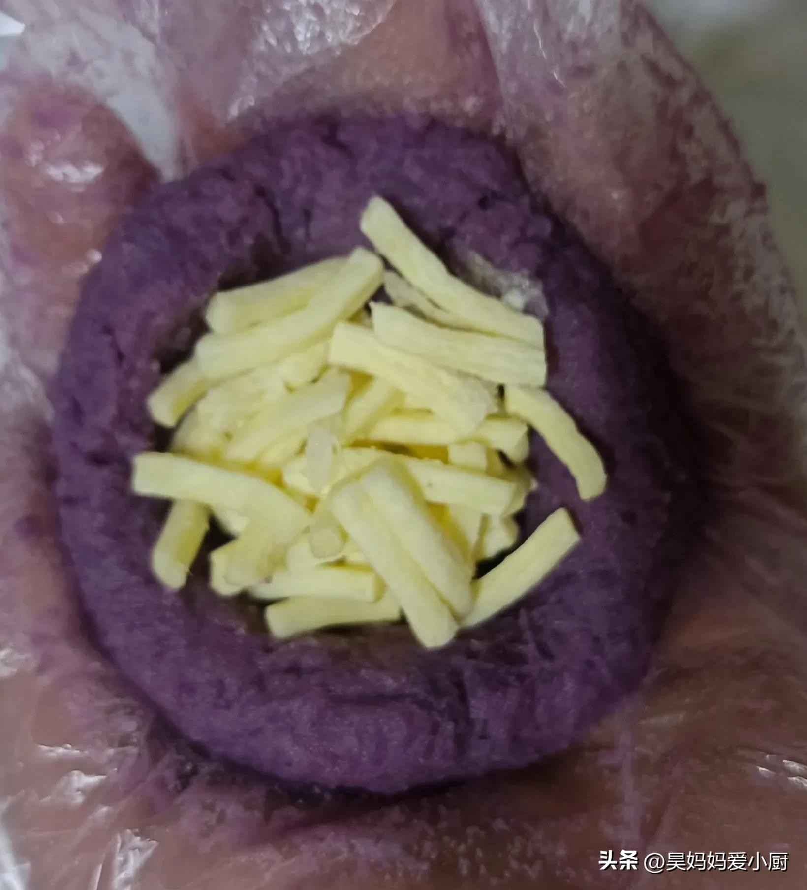 先把紫薯泥和成面团,揪成100克左右的圆团,里面加上自己喜欢吃的馅料,二次团成圆团。